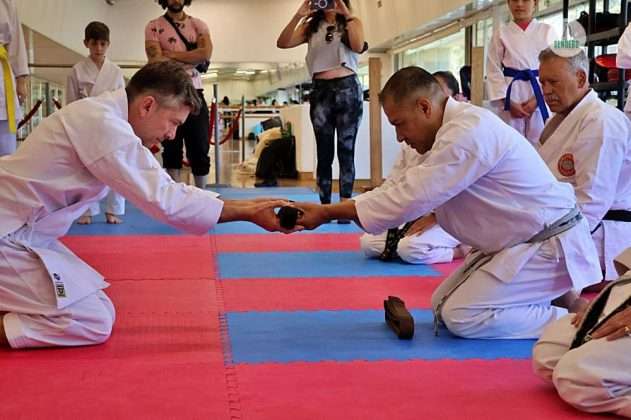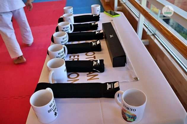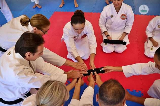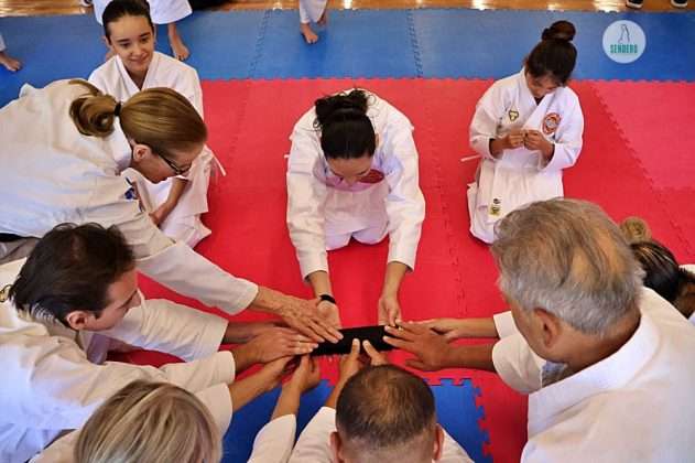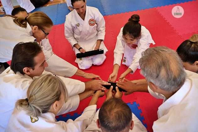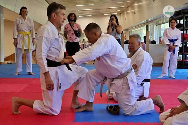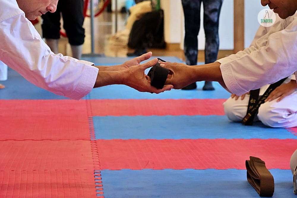 De manera ceremonial, cada karateka procedió a sentarse en Seiza, realizar la tradicional reverencias para pasar a despojarse de su antigua cinta y entregarla en manos de su maestro, quien a cambio tomó con respeto la nueva cinta con el grado Dan y procedió a amarrarla a su cintura, confirmando su nuevo camino.