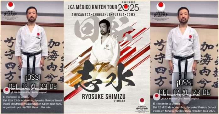 El Shihan Ryosuke Shimizu, con una reverencia de saludo (Oss), confirmó que estará en el país del 12 al 23 de noviembre para la gira organizada por JKA WF México City. El mensaje, emitido en japonés con subtítulos en español, concluye con una frase que formaliza la convocatoria: “Esperamos con entusiasmo su participación”.