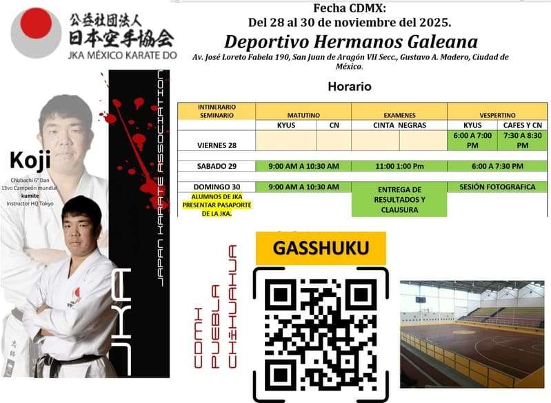 El “Gasshuku 2025” iniciará en la capital del país del viernes 28 al domingo 30 de noviembre, teniendo como sede el Gimnasio del Deportivo “Hermanos Galeana”, ubicado en Avenida José Loreto Fabela 190, colonia San Juan de Aragón VII Secc, Alcaldía Gustavo A. Madero, CDMX.