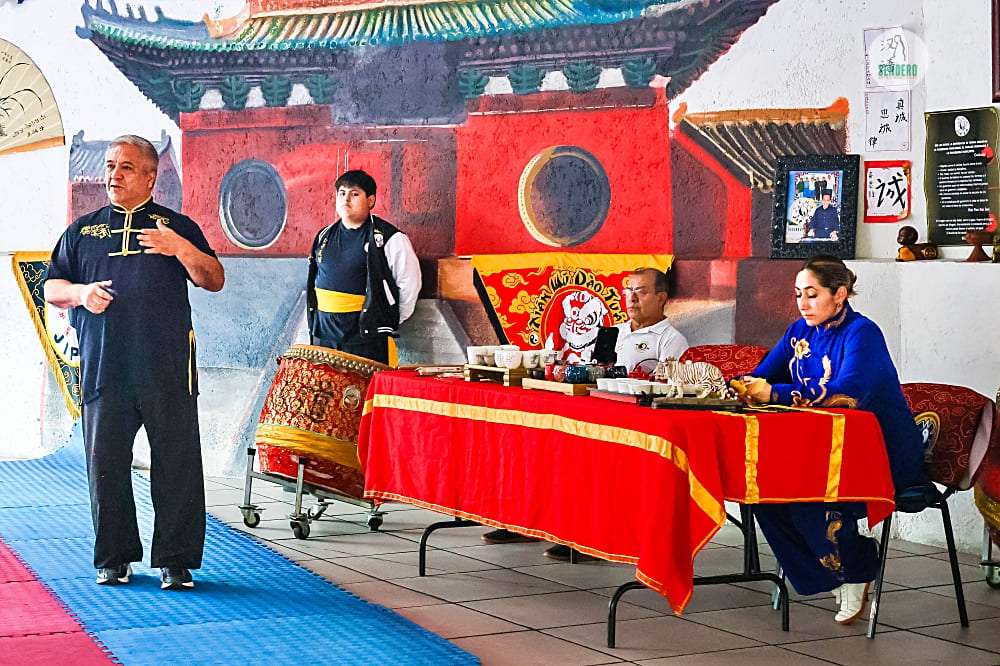 El espacio se engalanó con una mesa de honor con objetos representativos de la cultura china y juegos de té listos para la ceremonia, donde la apertura estuvo presidida por el Shifu Enrique Lozada, director del CES Wushu y del Estándar de Competencia, junto con la maestra Elizabeth García (área técnica), el maestro Sun Xia (sinólogo encargado de historia e idioma Chino) y el maestro José Luis Moreno.