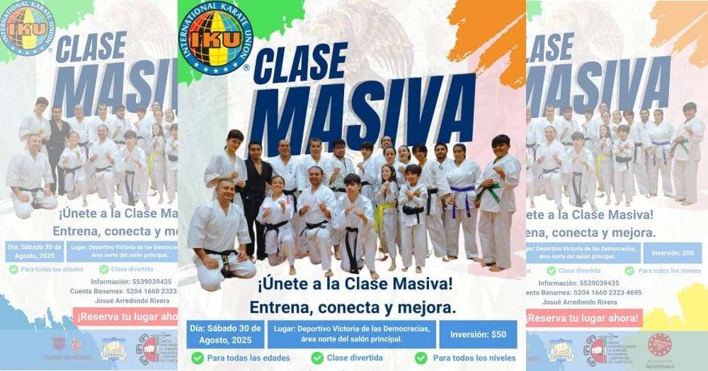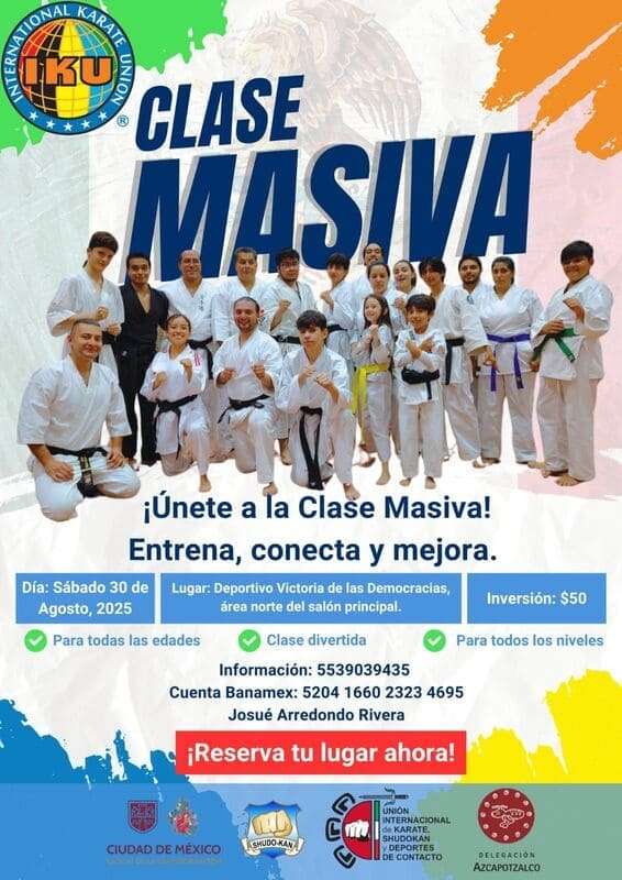 La delegación, conformada por atletas de varios estados y seleccionada en el pasado torneo selectivo, anunció el evento en sus redes sociales. Según la publicación de Kyoshi Josué Arredondo Rivera, representante de IKU México, la clase se realizará el sábado 30 de agosto, de 17:00 a 18:30 horas, en la zona norte del salón principal del Deportivo Victoria de las Democracias, ubicado en la Alcaldía Azcapotzalco, Ciudad de México.