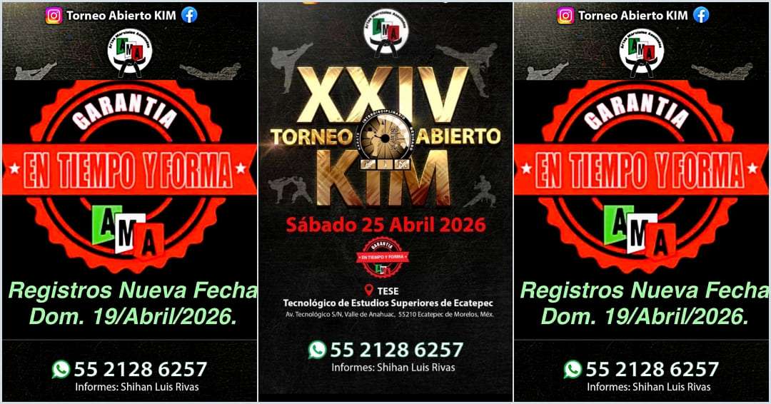 Ante el gran entusiasmo mostrado por practicantes y escuelas para formar parte del XXIV Torneo Abierto KIM 2026, el comité organizador ha decidido otorgar una prórroga para ampliar el periodo de inscripciones. Con esta medida, los interesados tendrán como fecha límite hasta las 23:30 horas del domingo 19 de abril para completar su registro y asegurar su participación en este evento de alta relevancia en el Valle de México.