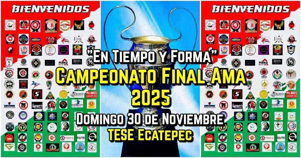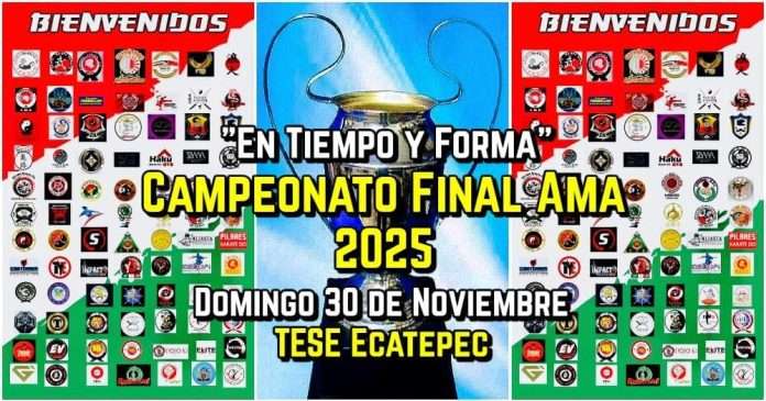 El Campeonato Final AMA 2025, el torneo abierto de artes marciales más esperado del Valle de México, está calentando motores, ya que más escuelas y organizaciones se siguen sumando para asegurar su participación en el evento que tendrá lugar “En Tiempo y Forma” el próximo 30 de noviembre en el Tecnológico de Estudios Superiores de Ecatepec (TESE).