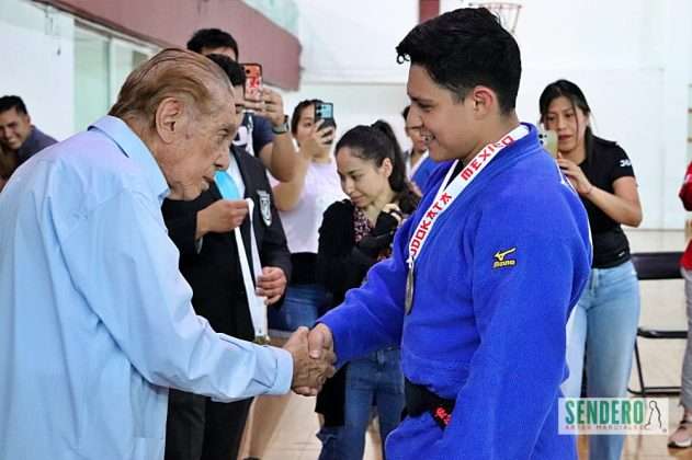 Durante su intervención, el profesor Manuel Larrañaga hizo un recorrido por la trayectoria del decano Peralta Alfaro, fundador de la academia Judokata México en 1966, institución de la que han surgido cientos de practicantes, instructores y competidores de nivel internacional.